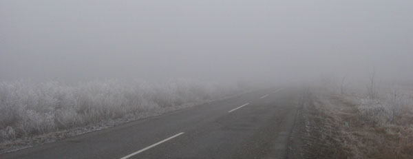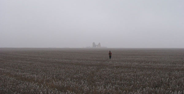 From that point on, the road leads through the endless fields. The frozen land silently crackles under the soles, the sluggish streaks of mist drag themselves over the frosty tilths. The line of the horizon sneaked within the couple hundred meters, and lurks. Just after a couple of steps, we completely disappeared into the mist.